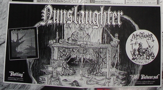 The band's line up experienced its first of many mutations in 1989, with Jer and Bill being replaced by Rick Rancid (guitar) and John Sicko (drums). NunSlaughter's second bastard offspring came screaming through the birth canal shortly thereafter, dragging its fetid placenta, "The Rotting Christ". The next band-member morphogenesis occurred in 1991 when Gregoroth and Sicko slithered away. Von the Impaler latched on as a drummer and Don of the Dead (still on bass) became NunSlaughter's vocalist as well. This repugnant assemblage produced the band's third demo, "Impale the Soul of Christ on the Inverted Cross of Death".