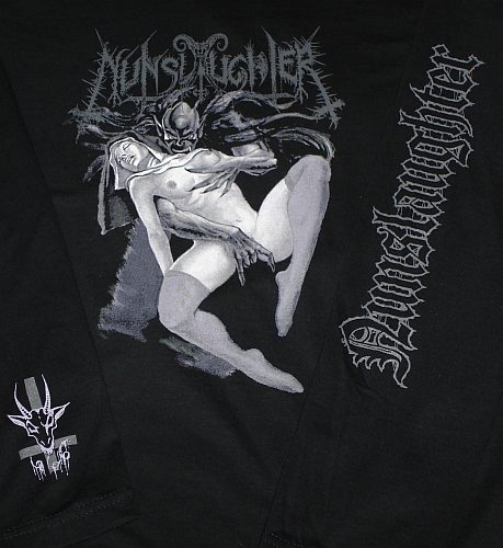 Official NUNSLAUGHTER black short sleeve shirt in sizes SMALL, MEDIUM, LARGE, XL and 2XL.   Also available as a LONG SLEEVE just in time for the freezing cold.   Killer European style (cuffless) only 50 made, available in sizes Medium, Large, XL and 2XL.   Original Fruit Of The Loom quality with professional high quality print on front, back & both sleeves.